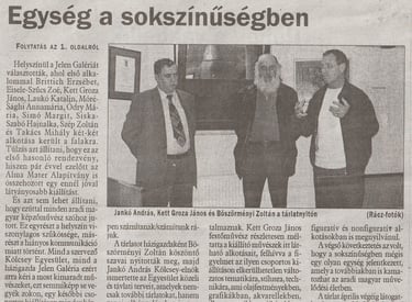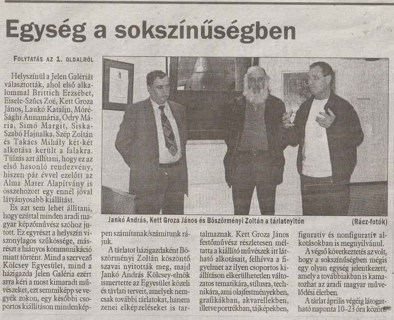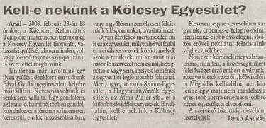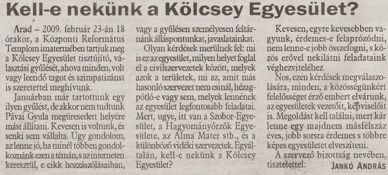 Nem hinném, hogy ez a pár észrevétel kedvét szegné a nagy lelkesedéssel és nem kis önfeláldozással a Kölcsey Egyesület továbbélése biztosításába belevágott társaságnak. Sőt! Minél többen melléjük állunk, és munkájukat jobbító szándékkal segítjük, az annál eredményesebb lesz. Már eddig is igazolták, meg tudják szólítani az aradi (magyar) művészeket, és azok válaszolnak is a hívásra. De, amint a példa is igazolja: a tanulópénzt mindenkinek meg kell fizetnie.”