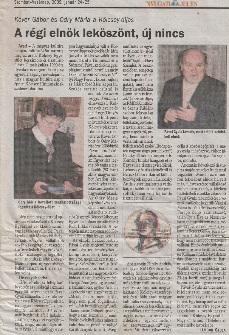 2009 január 22-én Pávai Gyula még levezette a Kölcsey-díjakat átadó ünnepséget, beszámolt az előző évek eredményeiről, azután bejelentette, hogy lemond elnöki posztjáról, mivel elköltözött Aradról.