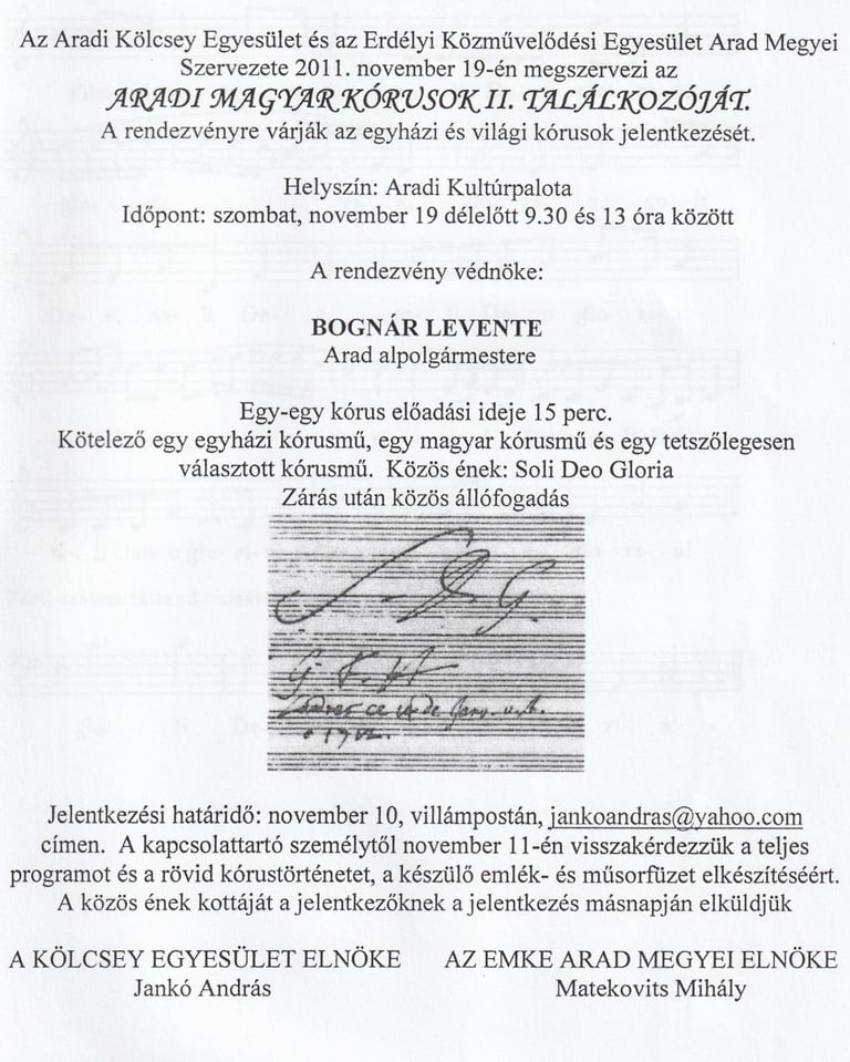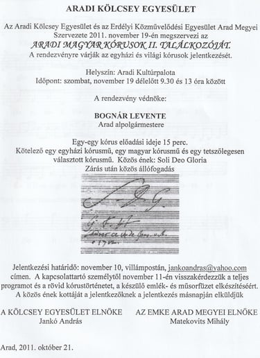 Szombat délelőtt ünnepélyesen leplezték le a Kölcsey Egyesület emléktábláját a Kultúrpalota falán, majd a kisiratosi férfidalárda és az aradi magyar baptista gyülekezet énekkara adott hangversenyt a Filharmóniában. (Miután az Arad megyei magyar kórusok második találkozóján csak ez a két együttes jelent meg.) (Krónika)